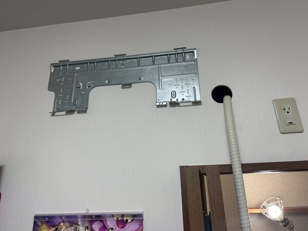 室内機はコンセント真上に室内機が来てしまうのを避けて右裏抜きで点検口の中で接続するようにしました。