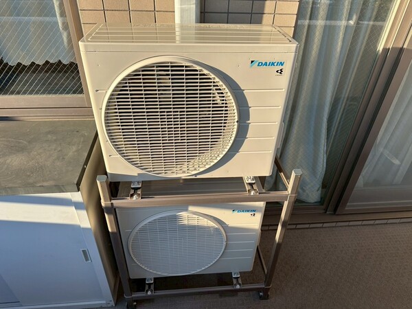 室外機は二段ラックになるのでまず下の室外機分の冷媒管を延長し直してからラックを組み立て、接続。