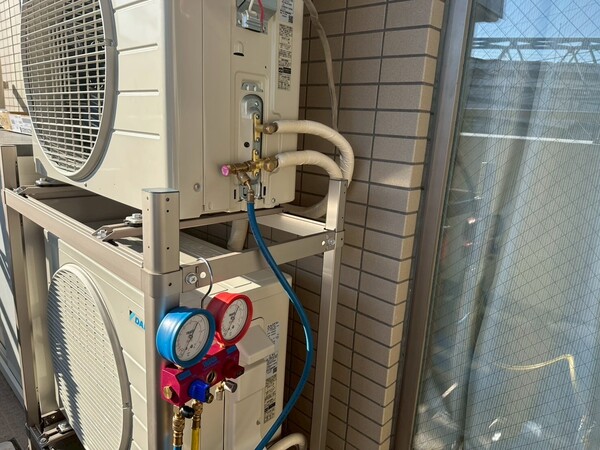 下の室外機の断熱仕上げてる間に上を真空引いて漏洩検査。